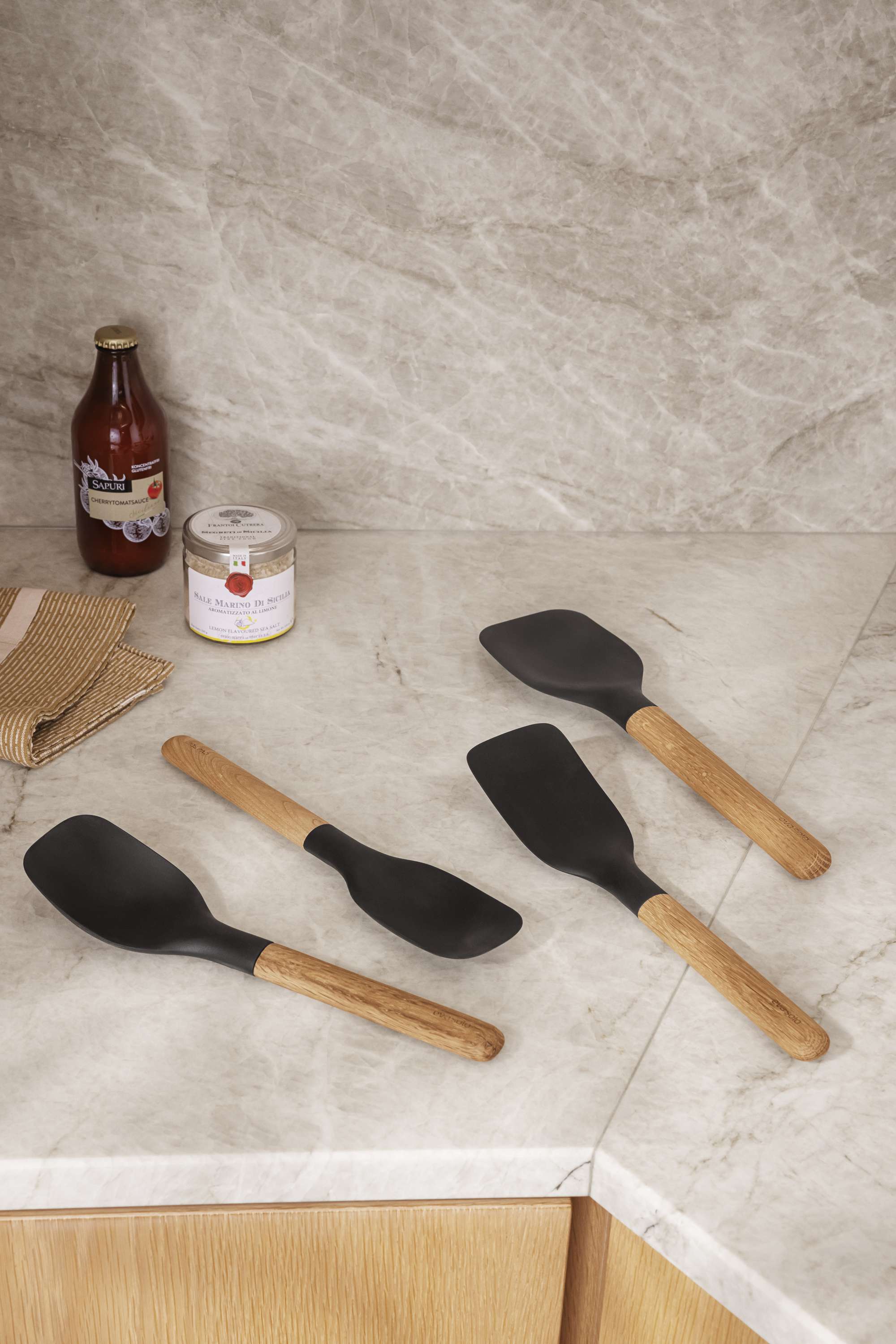 Et alsidigt redskab til køkkenet, som ikke blot er med til at gøre madlavningen nemmere. Det rustikke egetræsskaft og den sorte silikone klæder også køkkenet. Præcist som en skarp kokkekniv kan en god grydeske, røreske eller spatel gøre en væsentlig forskel, når gryder og pander er på komfuret, og du er godt i gang med madlavningen.