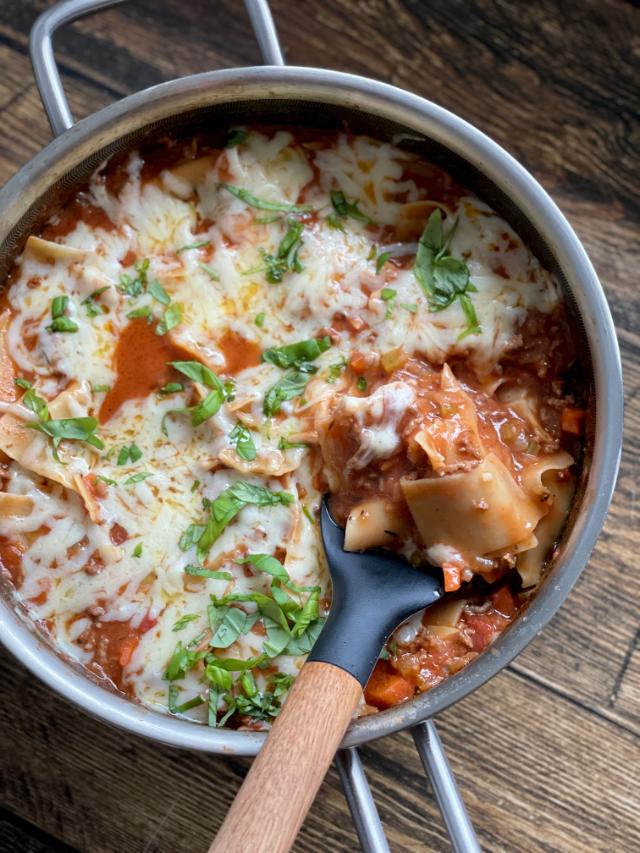 Her finder du @Madmusens opskrift på One Pan lasagne, der er tilberedt i den nye Multi Mosaic sautépande fra Eva Trio. Stegepanden tåler både en tur i ovnen og derefter opvaskemaskinen, hvilket gør at retten kan laves på kun 30 min og samtidigt minimerer opvasken.