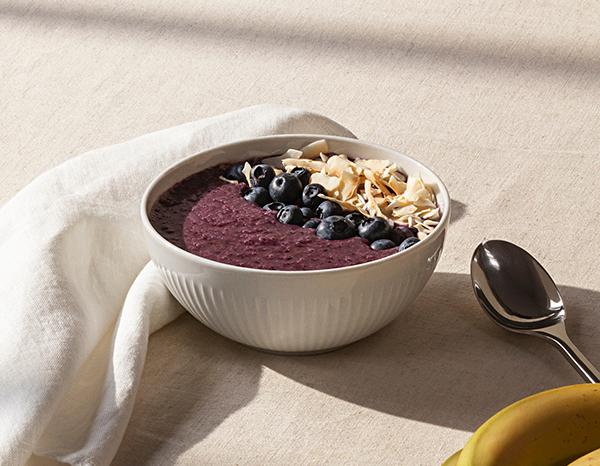 Blend alle smoothie-ingredienser til du har en ensartet smoothie. Hvis du vælger at bruge frossen banan bliver smoothien mere tyktflydende. Hæld smoothie op i en skål.
