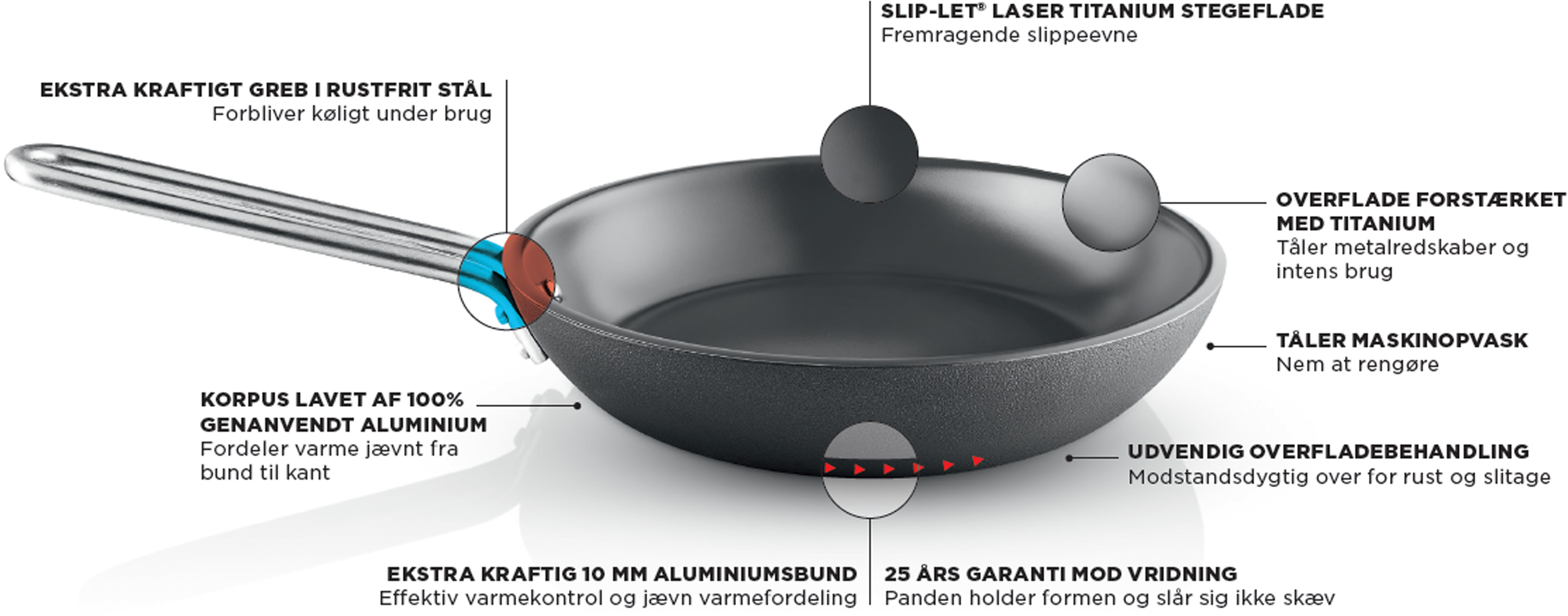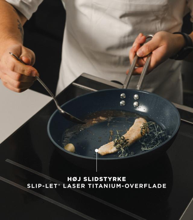 Slip-Let® Laser Titanium er vores mest avancerede overflade. Ved hjælp af laserteknologi bindes en titaniumlegering direkte i metallet, hvilket skaber en PFAS-fri overflade med Slip-Let®-effekt i absolut topklasse. Samtidig er titaniumoverfladen utrolig slidstærk og udviklet til intensiv brug. Den tåler metalredskaber, utallige ture i opvaskemaskinen og høj ovnvarme uden at miste sine egenskaber.