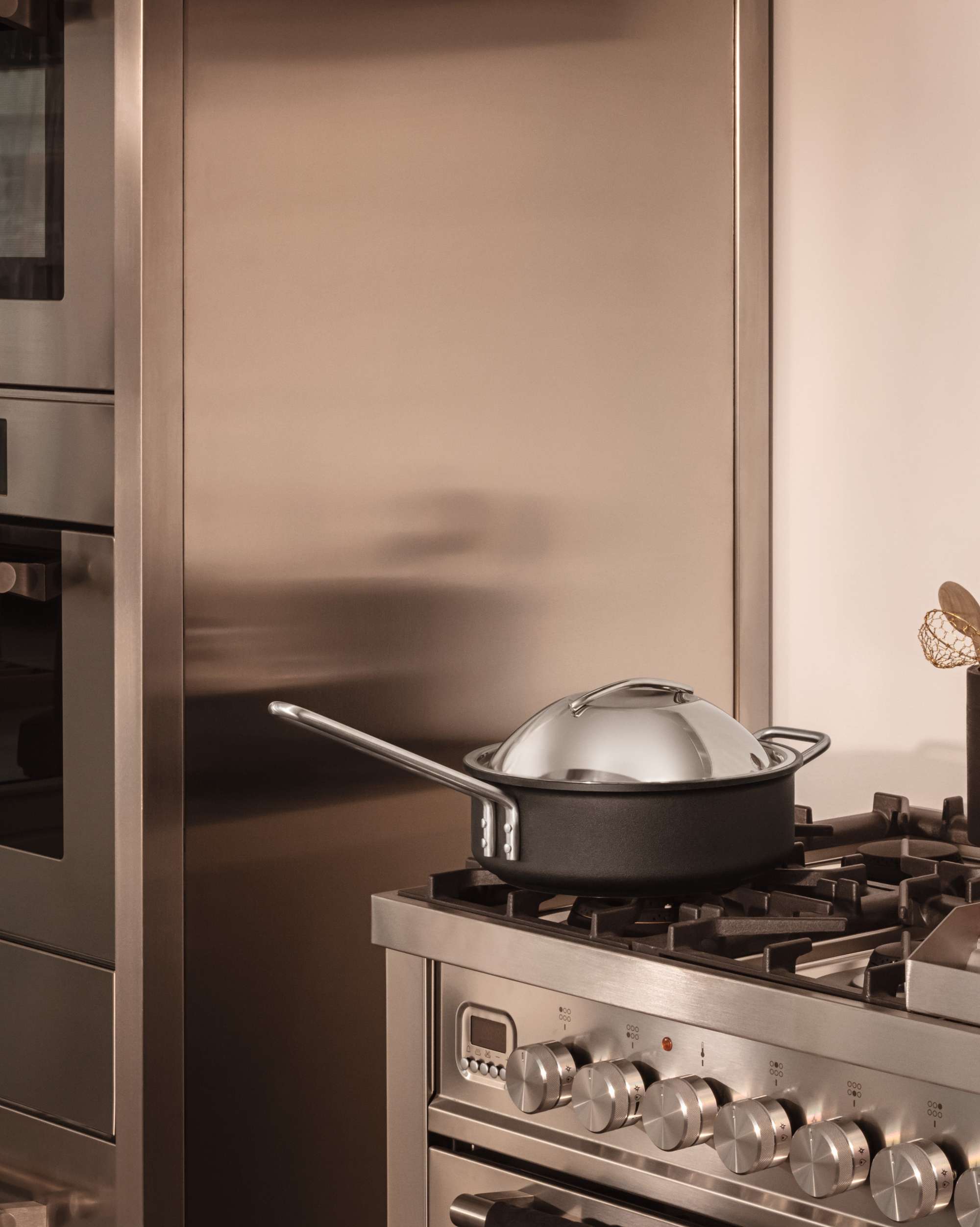 - Kuppellågets buede form giver ekstra plads i gryden eller panden