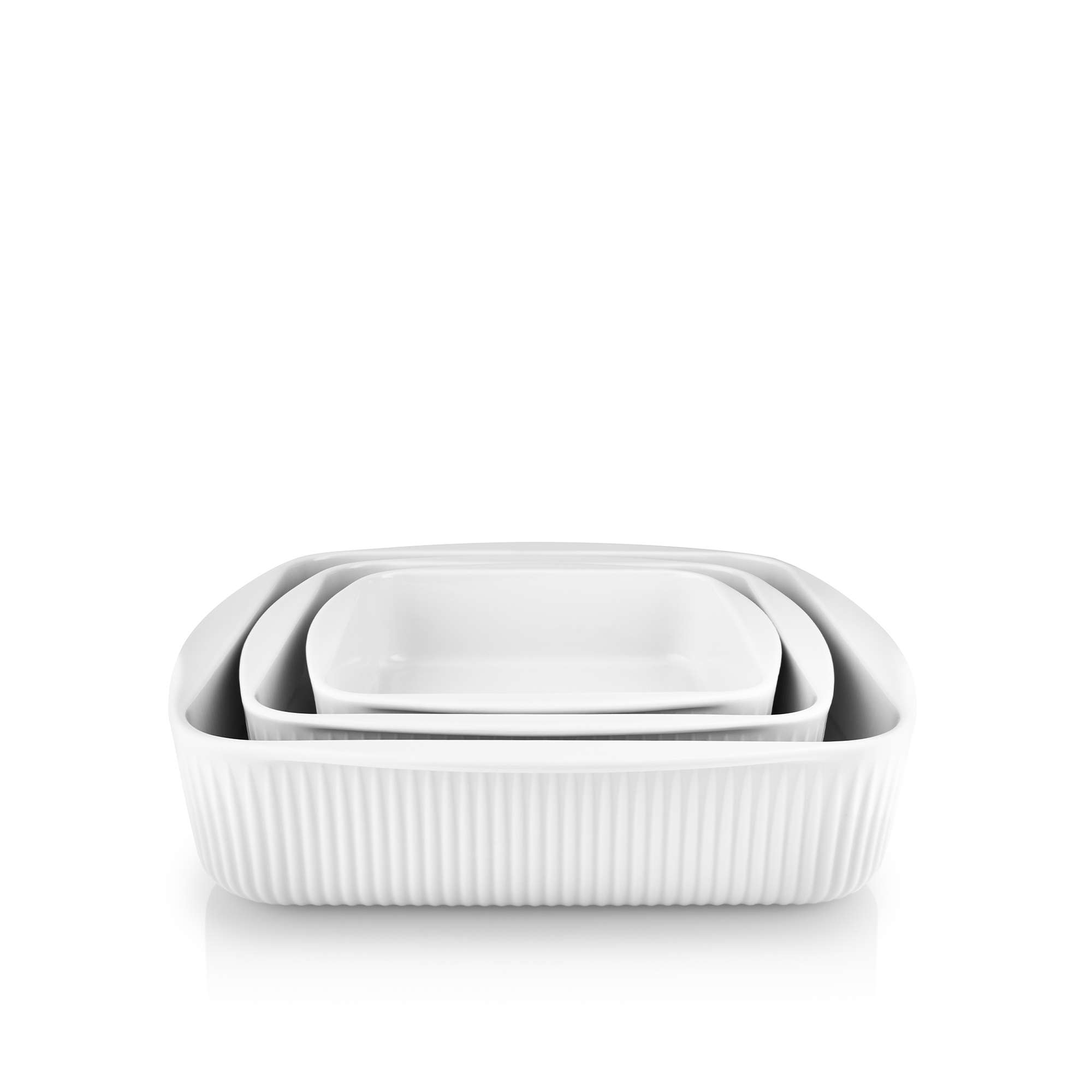 Ud af ovnen og direkte på bordet! Det elegante ovnfaste fad i rillet, hvidt porcelæn kan tåle at gå fra fryser til ovn. En praktisk kant i begge ender sikrer et godt greb i det varme fad, og en god dybde giver desuden mange anvendelsesmuligheder, bl.a. til servering af salater, frugt eller tilbehør. Tåler også mikroovn og maskinopvask. Fremstillet i porcelæn. Mål: 20x20, 24x24 & 29x29 cm.