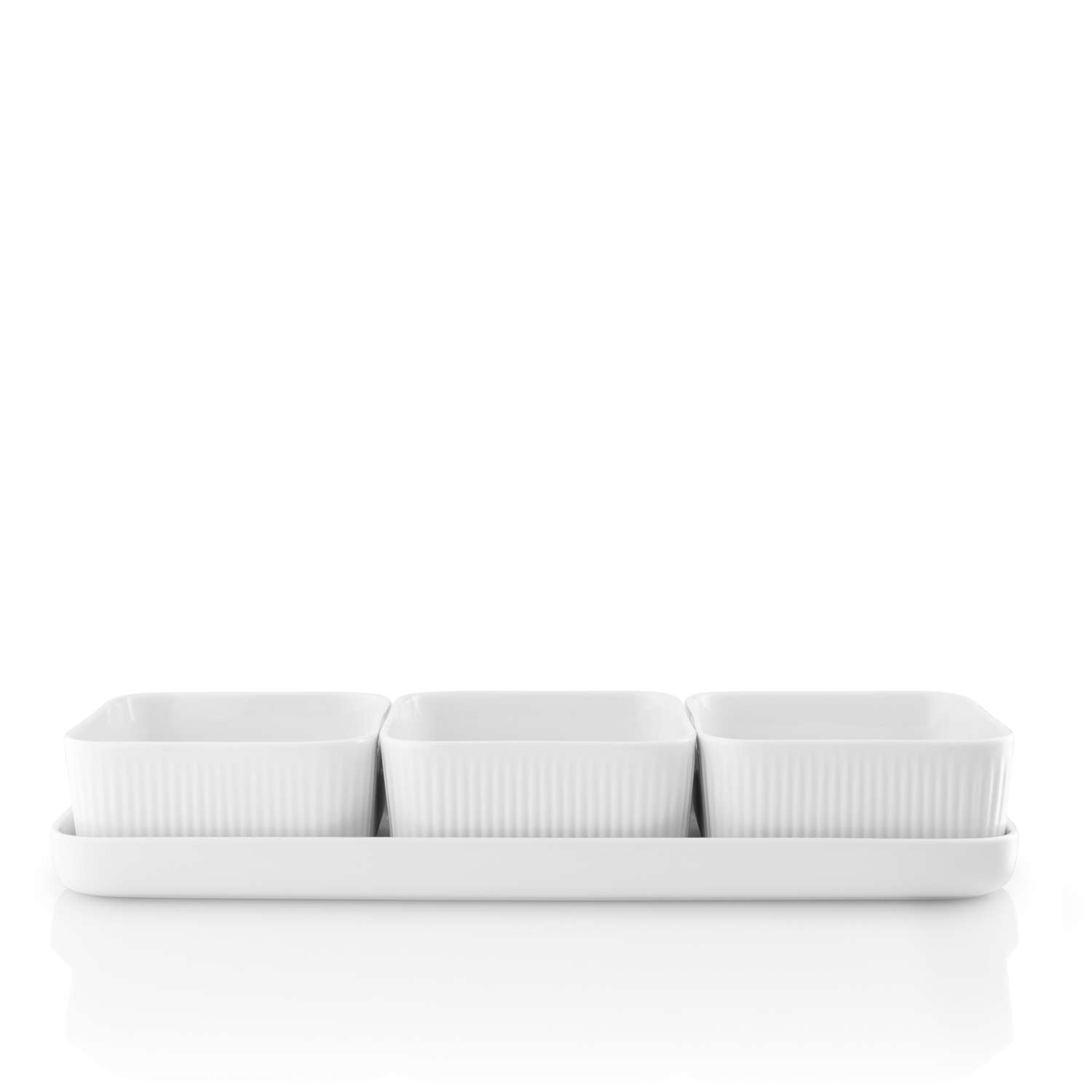 Tapas-sættet pynter på bordet og har mange serveringsmuligheder. Brug det til alverdens små varme og kolde retter, der serveres som snacks eller kombineres til en lækker tapas-anretning. Det aflange fad kan bruges til servering af for eksempel udskårne grøntsager og brødstænger. De små, praktiske skåle, til for eksempel dip eller oliven, kan stå alene på bordet eller bruges en, to eller tre sammen på fadet. Når tapas-sættet ikke er i brug, kan skålene opbevares i fadet, så det fylder minimalt.