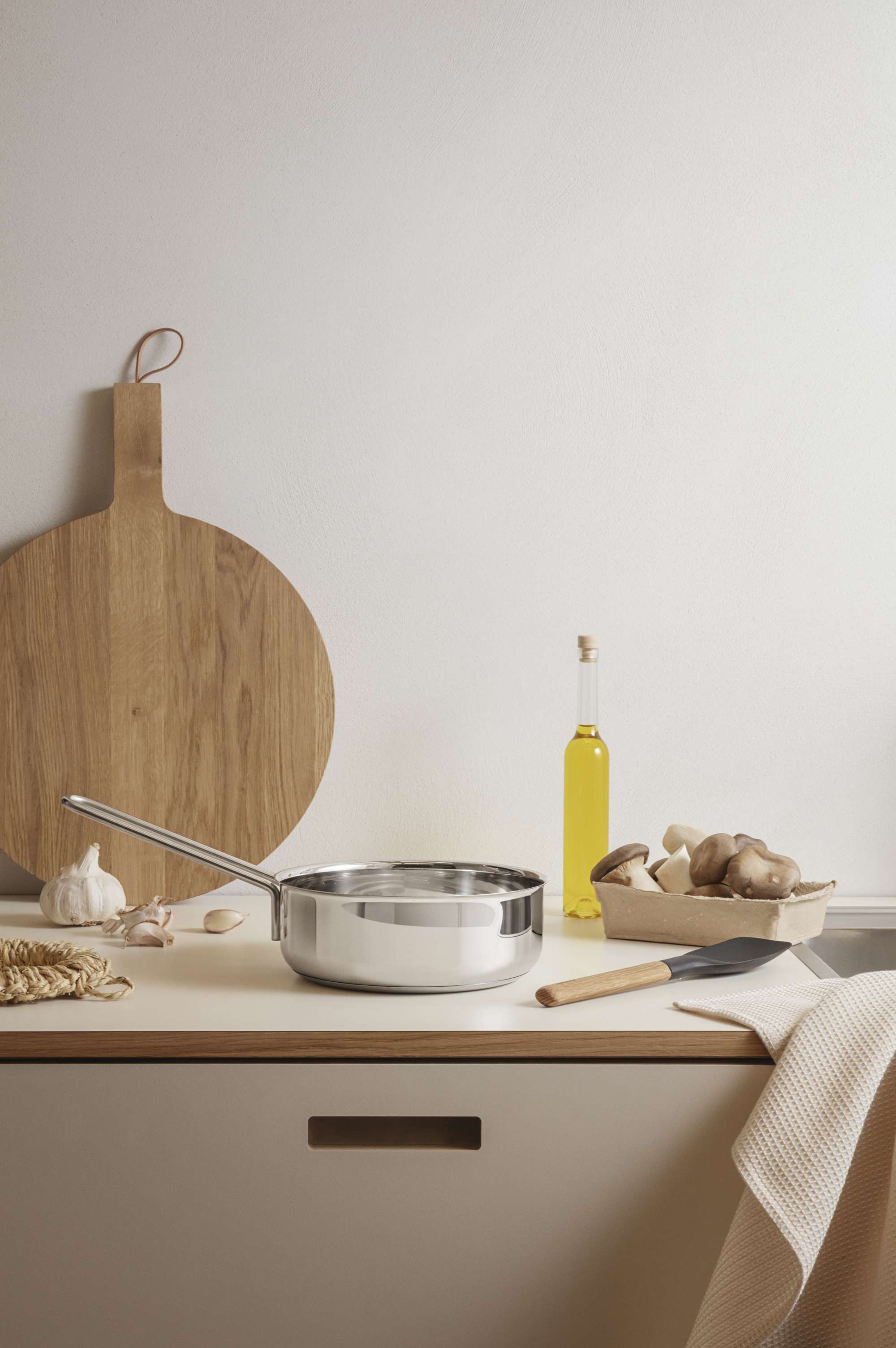 Sauterpanden giver dig et hav af muligheder; du kan stege, braisere, sautere og tilmed tilberede saucer og sammenkogte retter i den alsidige pande. De høje, lige kanter sikrer, at selv væskeholdig mad forbliver, hvor den skal – også under hurtig omrøring. Sauterpandens korpus er fremstillet af 90 procent genanvendt post-consumer rustfrit stål. Det robuste materiale tåler slitage og håndtering, mens den indkapslede sandwichbund sikrer jævnt fordelt varme. Designet er baseret på det klassiske Ole Palsby/Eva Trio-design fra 1977, hvilket sikrer kompatibilitet med eksisterende Eva Trio-låg. Sauterpanden fungerer på alle typer af varmekilder og tåler maskinopvask.