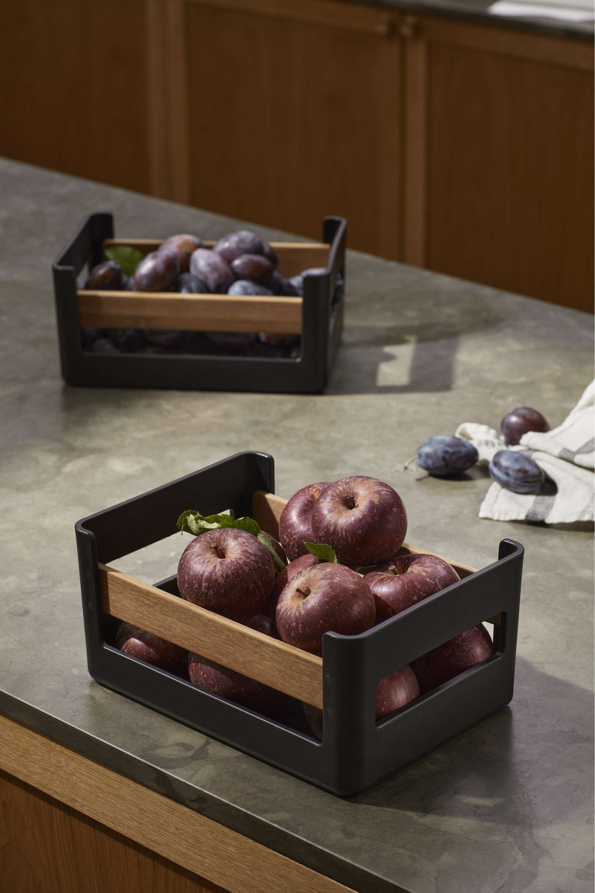 Die Lebensmittelkiste ist eine praktische und vielseitige Aufbewahrungsbox, die in der Küche für Organisation und Ordnung sorgt. Hier können Sie Küchenutensilien, Gemüse, Obst und andere Dinge aufbewahren. Die Kiste lässt sich bequem an den beiden Griffen tragen und kann mit zum Einkauf, Picknick oder Camping genommen werden. Die Lebensmittelkiste aus FSC®-zertifiziertem Bambus und vollständig recycelbarem Kunststoff hält häufigem Gebrauch stand und lässt sich leicht zerlegen.