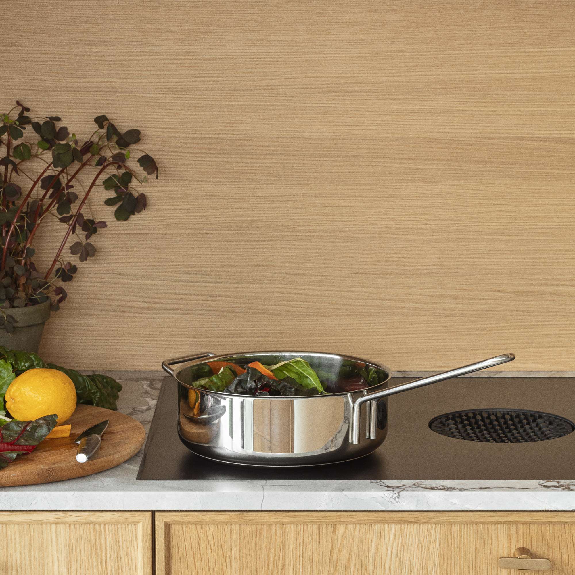 The sauté pan offers a wealth of possibilities; you can fry, braise, sauté and even prepare sauces and stews in this versatile pan. The high, straight sides ensure that even liquid food stays where it belongs - even during vigorous stirring. The body of the sauté pan is made from 90% recycled post-consumer stainless steel. The robust material withstands wear and handling, while the sealed-in sandwich base ensures even heat distribution. The design is based on the classic Ole Palsby/Eva Trio design from 1977, ensuring compatibility with existing Eva Trio lids. The sauté pan is suitable for all types of heat sources and is dishwasher safe.
