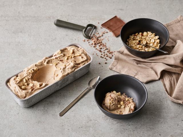 Freeze the ice cream mixture in an ice cream maker and place in a baking tin (1.3 litre). Freeze until at least a couple of hours before serving.