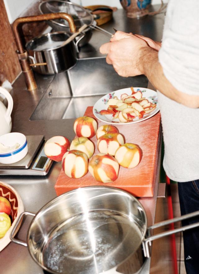 Peel and core the apples and place the flesh of the apples in a pot along with the bay leaf. Add a bit of water, put a lid on the pot and allow the apples to steam until completely tender and most of the liquid has evaporated. Puree the apples using a whisk or a wooden spoon. Add sugar to the pot and let it simmer at low heat. Season with some lemon juice and salt.