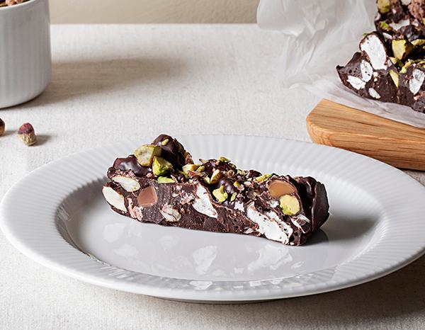 Try this new variant of the famed no-bake slice or tiffin packed with caramelised almonds, pistachio nuts, marshmallows and toffee. Indulge in this sweet treat with a cup of coffee in front of the wood fire, or serve up for festive season celebrations.