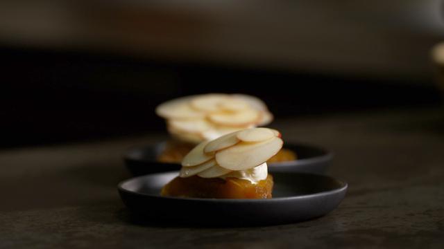 - Cut the tart into appropriate pieces and serve with a spoonful of mascarpone cream covered with slices of raw marinated apple.