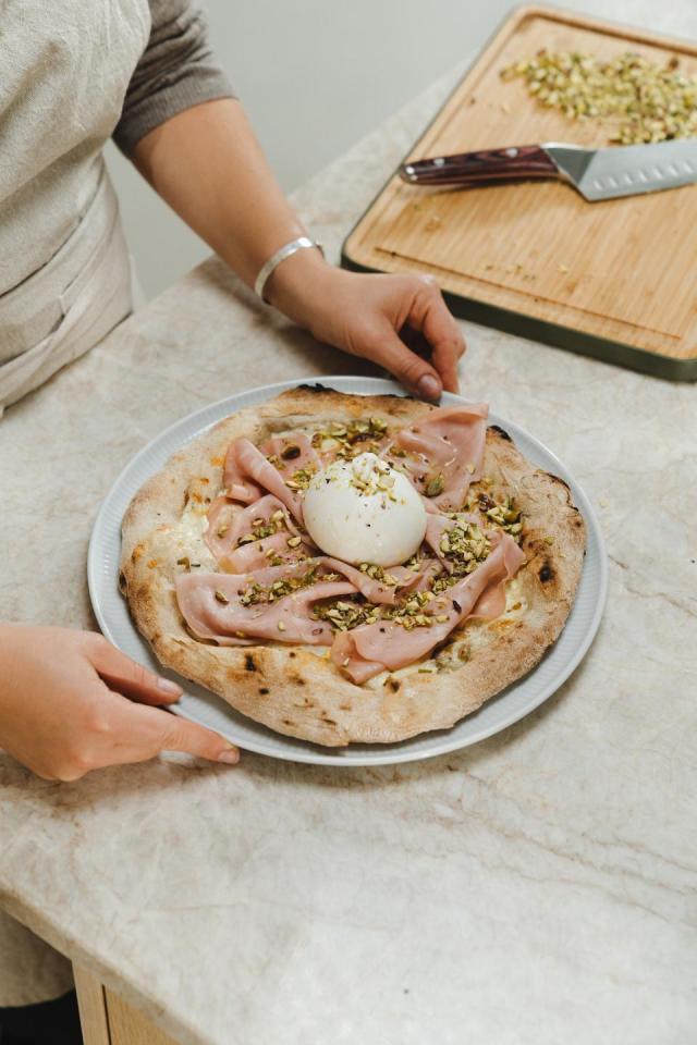 - Remove the pizza from the oven and top with mortadella, chopped pistachios, and burrata.