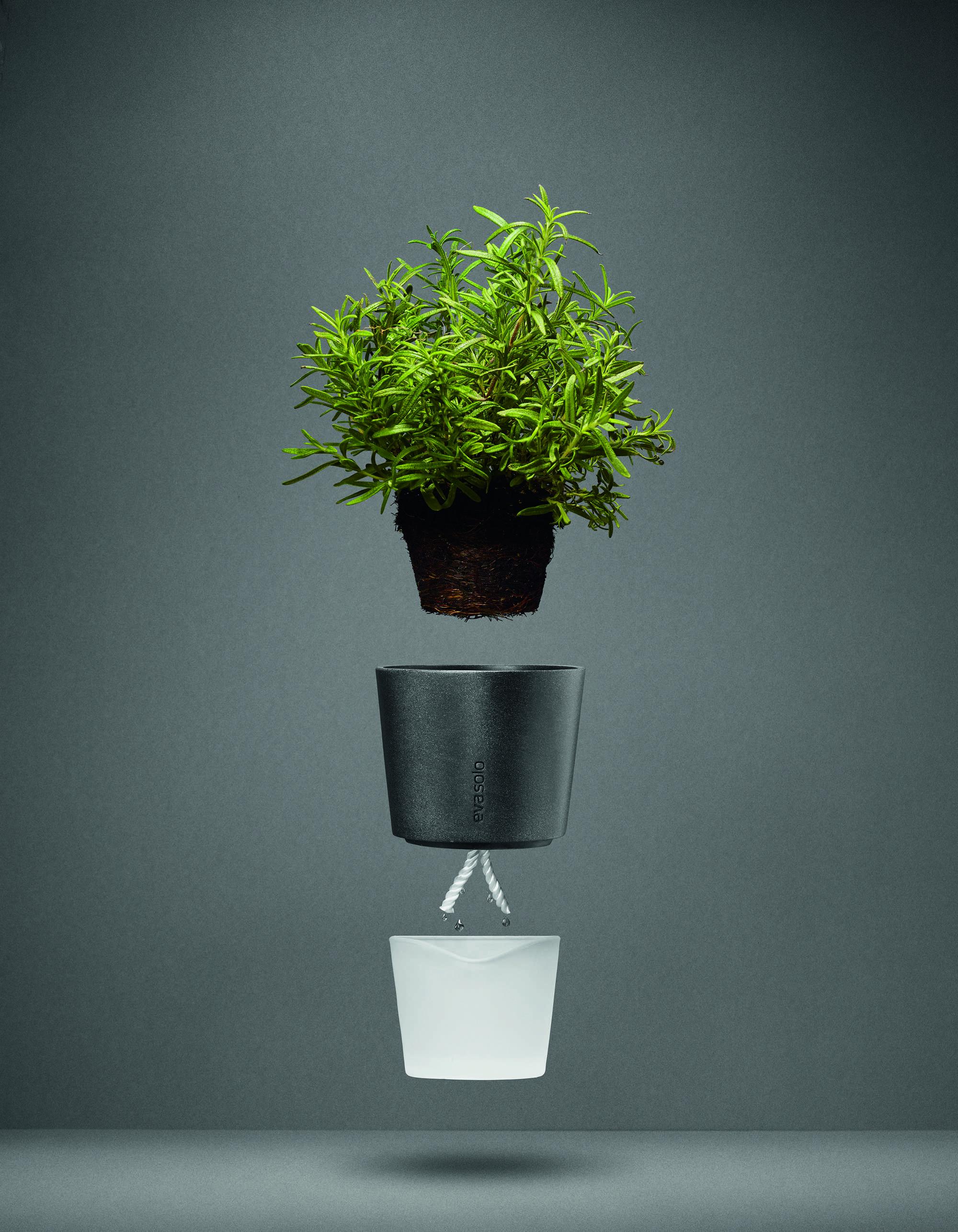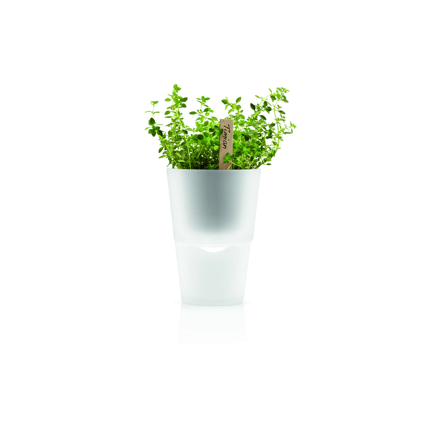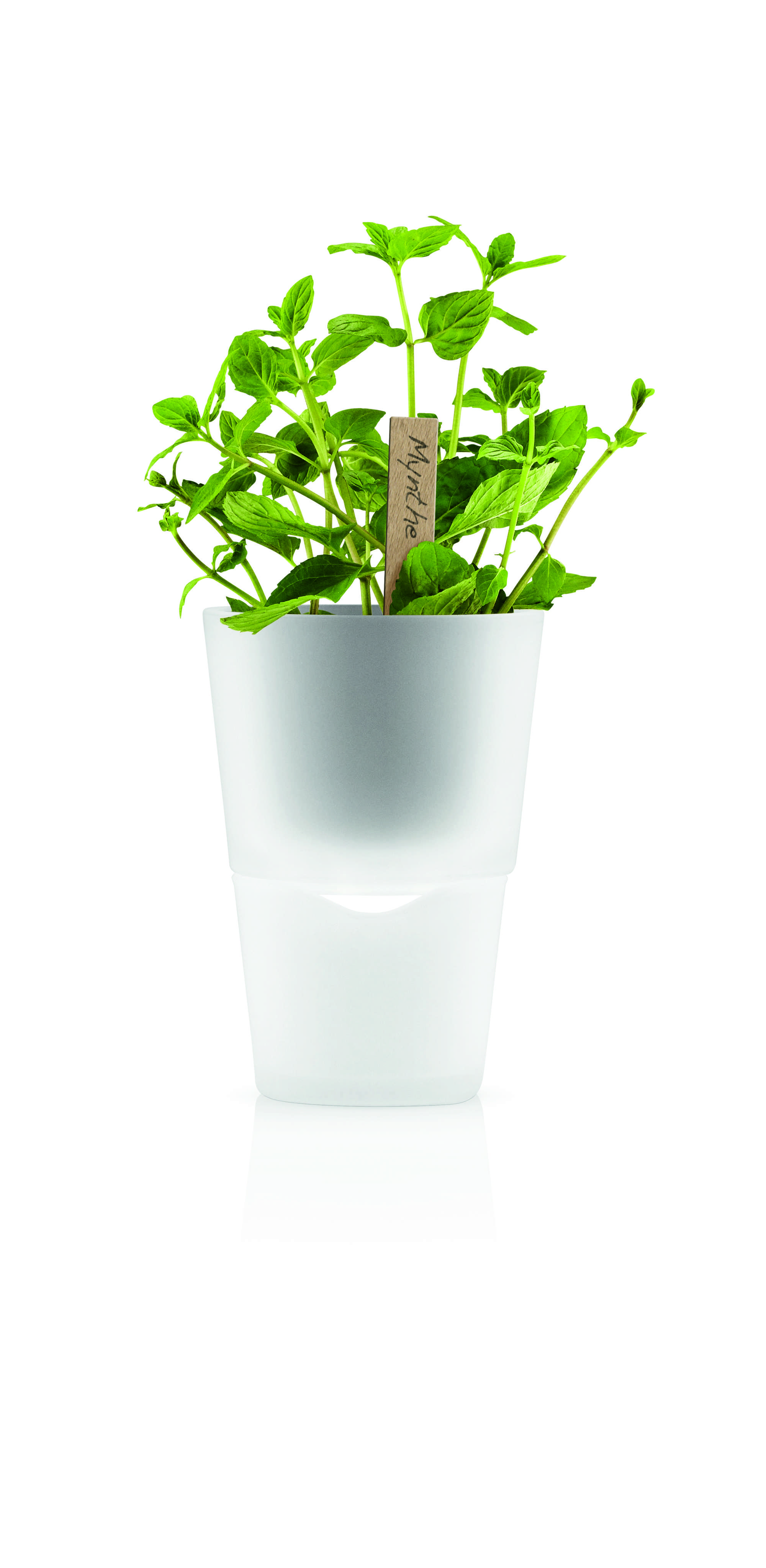 This self-watering herb pot enables you to always have fresh herbs to hand in the kitchen as it ensures optimum growing conditions for plants. By means of a nylon wick in the bottom of the pot, the plant draws up the water it needs to stay green and fresh. Made of frosted glass, plastic and nylon.