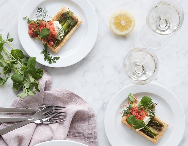 Mélanger 100 g de crème acidulée avec un peu de moutarde de Dijon, saler et poivrer ; ajouter un peu de ce mélange au milieu de chaque morceau de pâte feuilletée.
