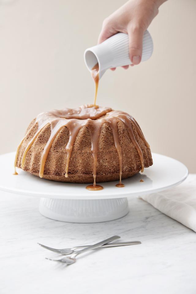 Placez le gâteau sur un joli plat. Nappez-le de caramel au bourbon, puis saupoudrez de noix de pécan et de pistache, et éventuellement de pétales de rose séchés. Servez immédiatement.