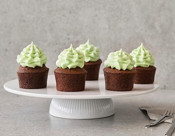L'accord parfait entre de moelleux muffins au chocolat et un glaçage crémeux à la menthe poivrée. Ils seront encore plus festifs si vous ajoutez une pointe de colorant vert au glaçage.