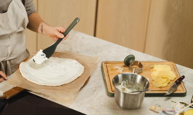 - Faire une crème en mélangeant le mascarpone, l'huile d'olive, le sel, le poivre et de l'ail fraîchement râpé. Couper les pommes de terre en fines tranches à l'aide d'une mandoline.