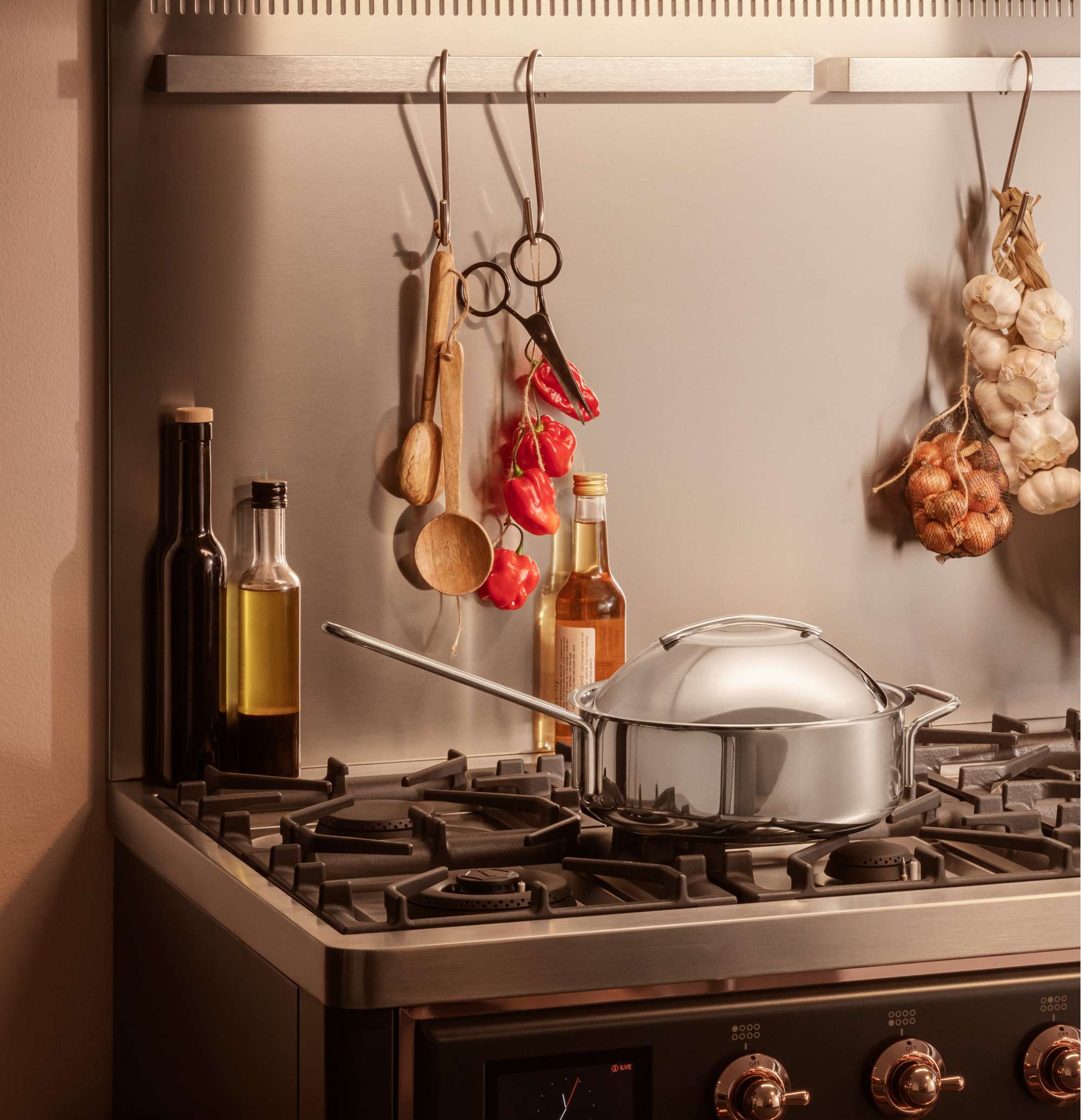 The dome lid is specially designed for using on pans or sauté pans with space for food which rises up above the sides. The shape of the lid ensures that the vapours gather at the top of the lid (on the inside), after which they drop back into the food, preserving juices and consistency.