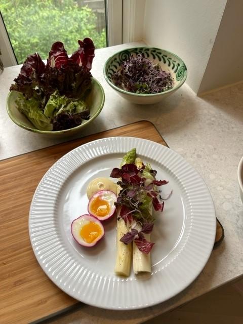 - Plate the dish by arranging 2 asparagus spears, a dollop of mayonnaise, a halved beetroot egg, and some salad on top.