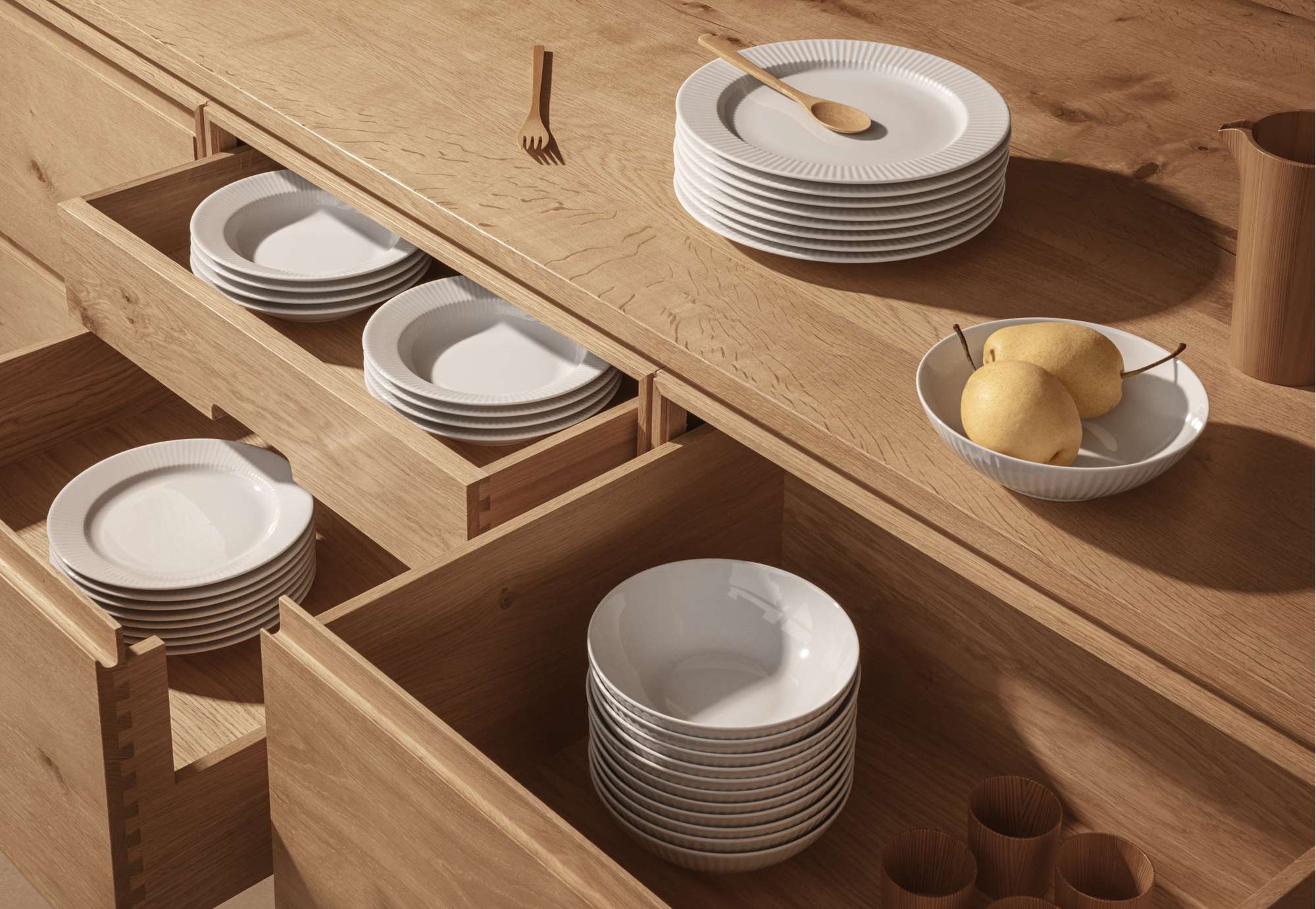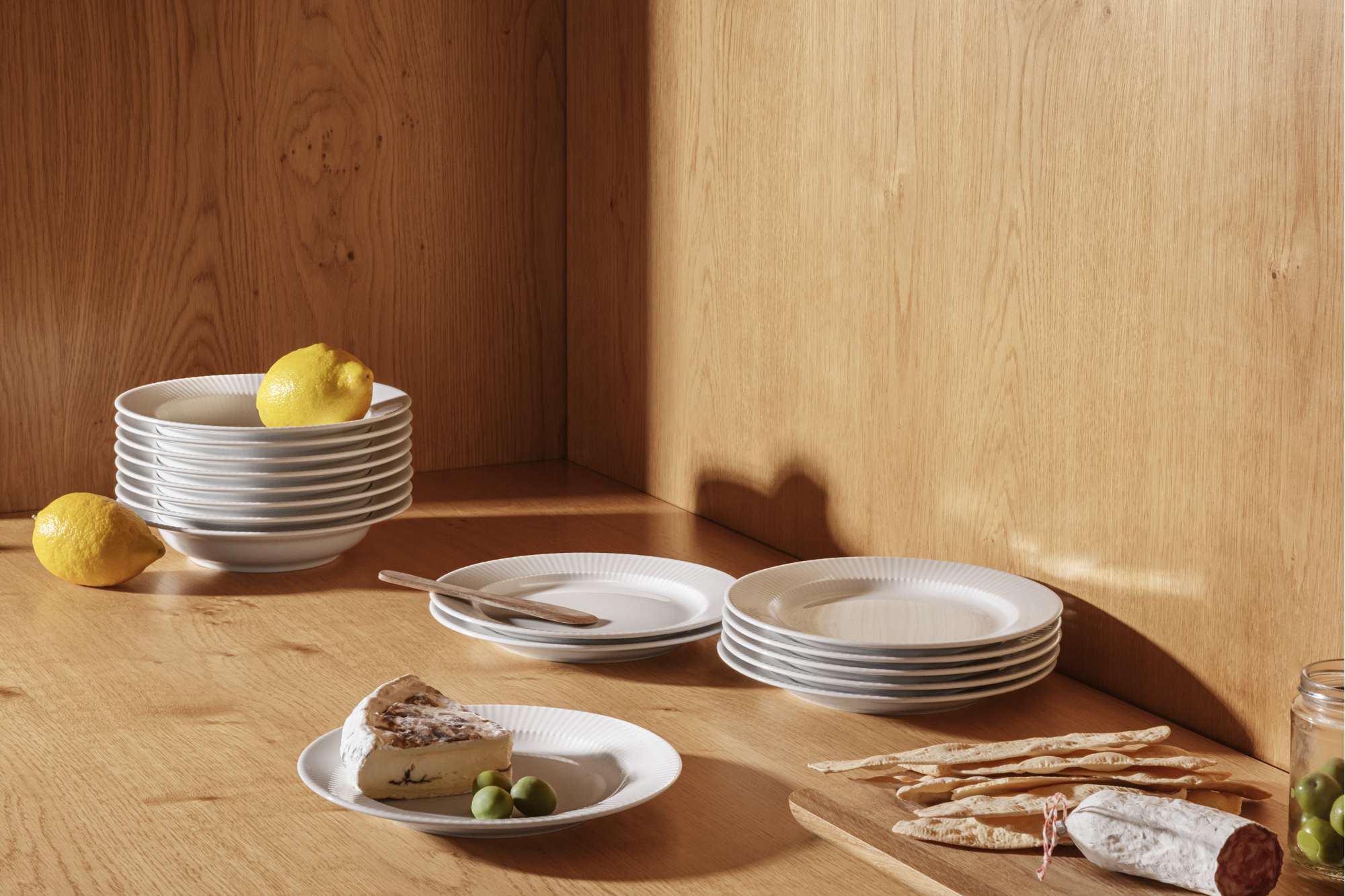 The Legio Nova design is based on the Legio tableware that was introduced in collaboration with the designer Ole Palsby in the late 1990s. While Legio is characterised by a minimalist design, the Legio Nova plates are more refined and detailed, and have been developed in collaboration with the National Culinary Team of Denmark. The design process was very much inspired by the team’s culinary art and by the care that goes into their craft. The central part of the plate is therefore framed by elegant grooves to enhance the food presentation. The two series go extremely well together, and can certainly be mixed and matched, as the grooves on the Legio Nova pieces contrast beautifully with the perfectly smooth Legio.