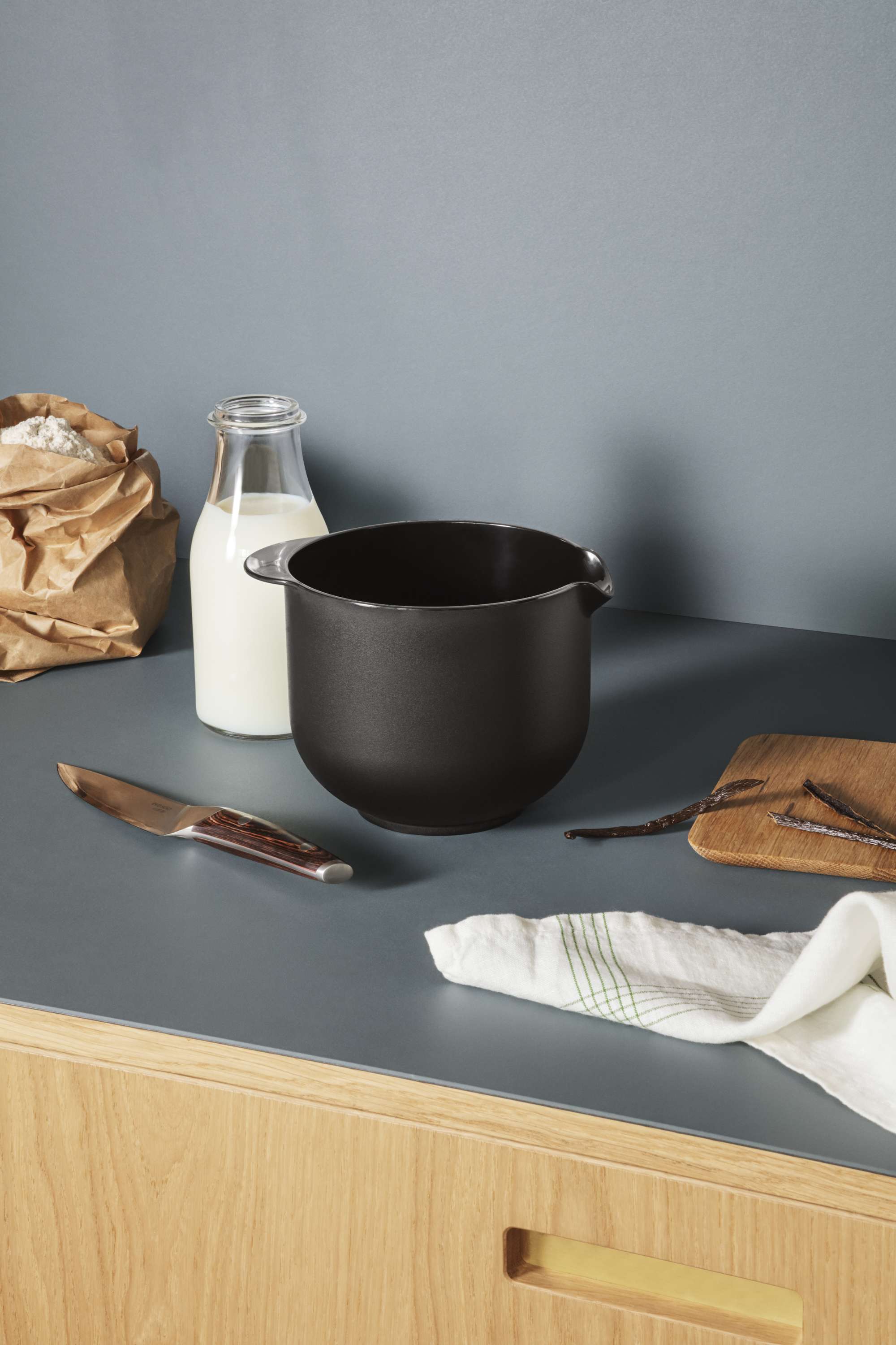 Bollen har i tillegg gummikant under bunnen slik at den står stabilt på bordet. Bruk Eva bakebolle til baking, som arbeidsbolle eller til vannbad – bollen tåler nemlig opptil 100 °C. Tåler dessuten fryser, mikrobølgeovn og oppvaskmaskin.