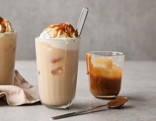 Fyll to glass med is, og hell i kaffen. Topp med pisket krem og karamellsaus. Pynt ev. med litt flaksalt, og server umiddelbart.