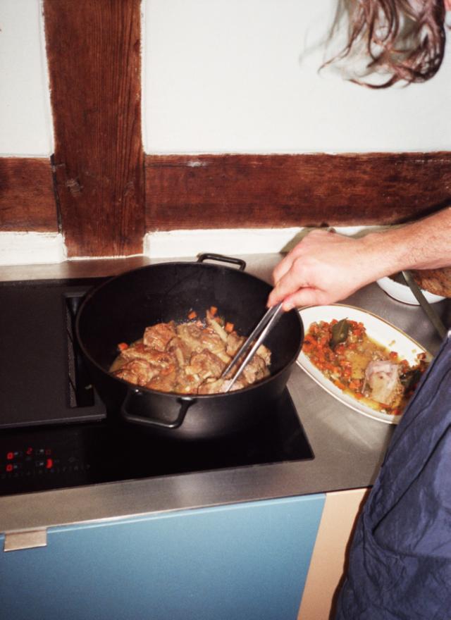 ● Place the meat back in the pot, add white wine and orange slices and put a lid on the pot. Let it simmer at medium heat for 1-1.5 hours. Gently stir the sauce throughout.
