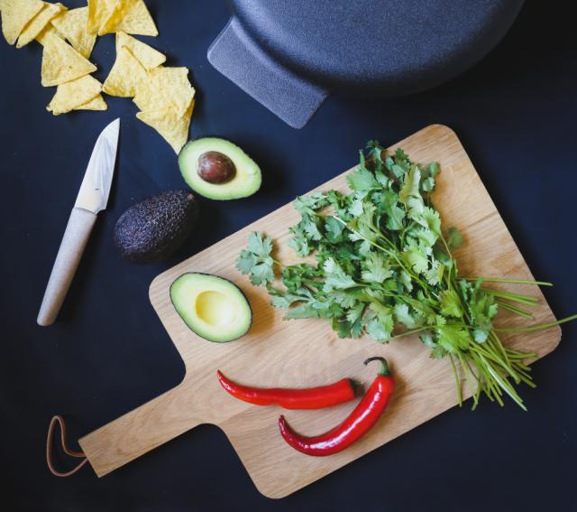 Skrell og hakk løk og hvitløk. Hakk chili, og skjær paprika i små terninger. Fjern skinnet fra chorizoen, og skjær den i små terninger.