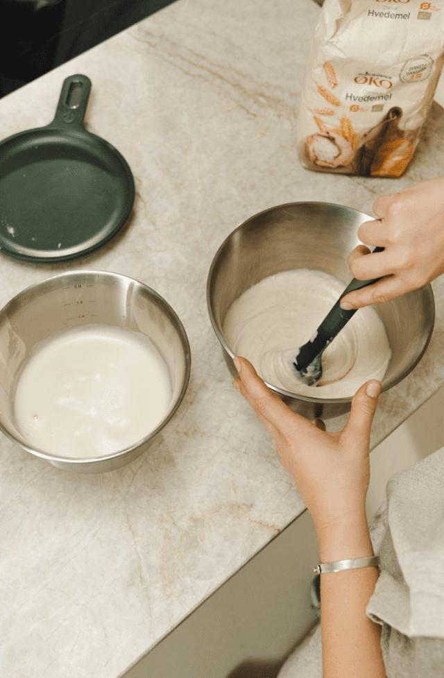 - Bland mel, bakepulver, salt, olje og melk i en bolle, og rør sammen til en jevn røre.