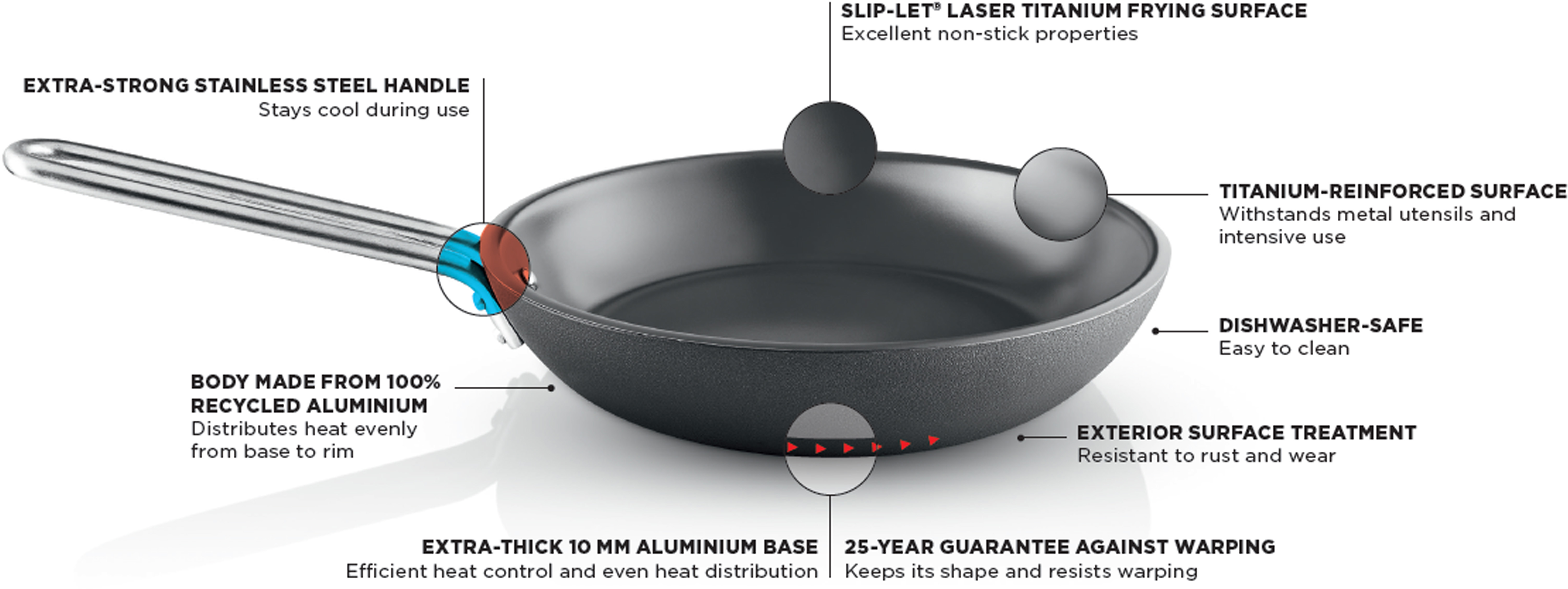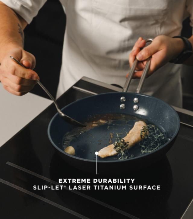 Slip-Let® Laser Titanium er vår mest avanserte overflate. Ved hjelp av laserteknologi bindes en titanlegering direkte til metallet, noe som skaper en PFAS-fri overflate med Slip-Let®-effekt i absolutt toppklasse. Samtidig er titanoverflaten svært slitesterk og utviklet for intensiv bruk. Den tåler metallredskaper, utallige runder i oppvaskmaskinen og høy ovnsvarme uten å miste egenskapene sine.