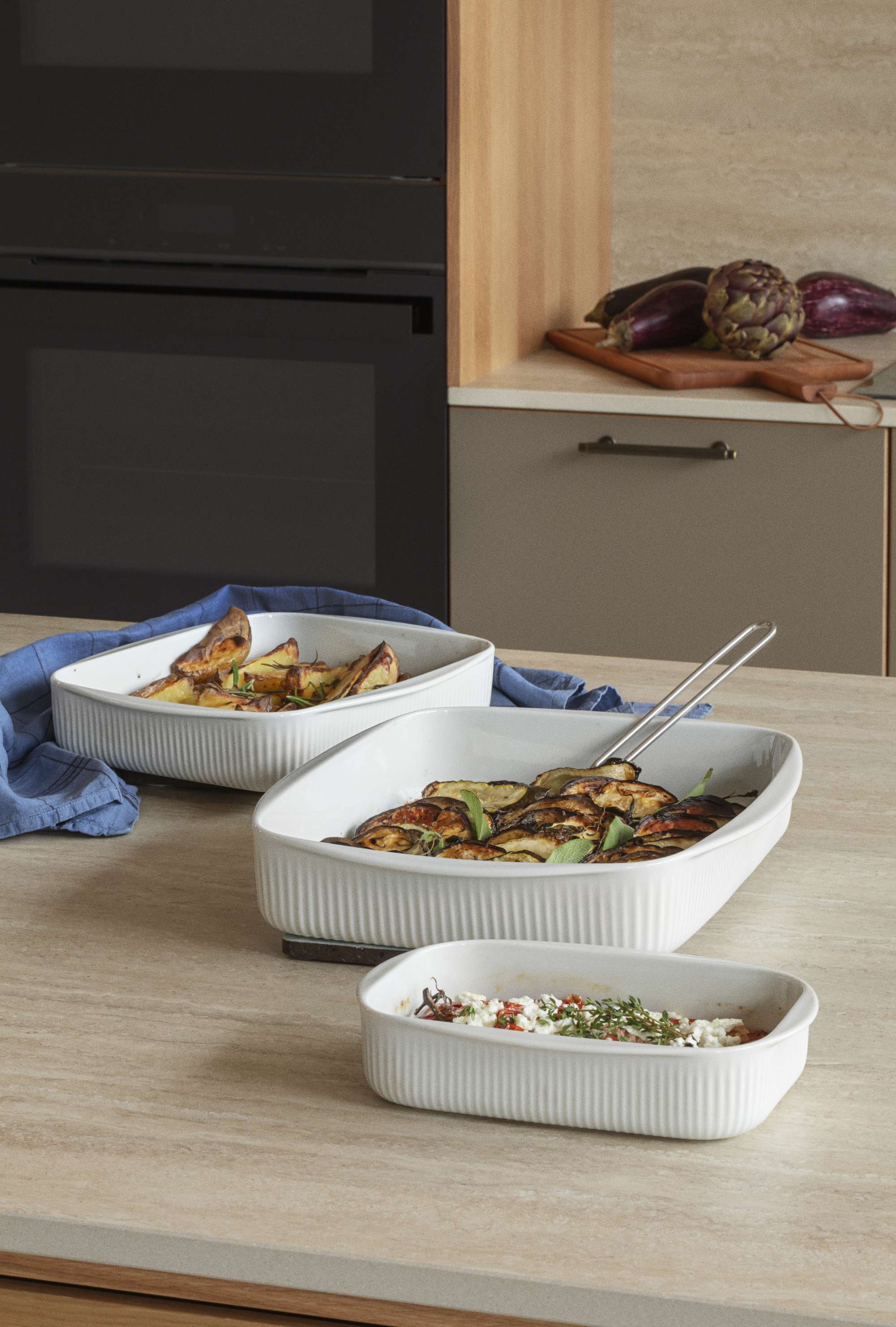 Ugnsfast form med Legio Nova-servisens karakteristiska räfflor pryder bordet samtidigt som de är praktiska med många användningsmöjligheter, från ugns- och grillrätter till frukt och sallad. De platta kanterna ger ett bra grepp och formen kan tas från frysen och ställas i ugnen eller direkt på grillen.