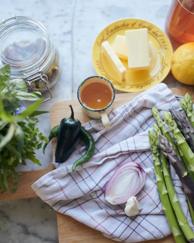 Asparagus are a herald of summer. Here, they are accompanied by a cold sauce with lots of herbs and wild garlic. An easy dish that’s a real ray of sunshine.