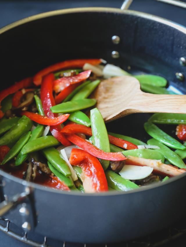 Skala lök och vitlök. Skär löken i fina bågar och hacka vitlöken. Skär paprikan i strimlor och champinjonerna i skivor. Skär av ändarna på sockerärterna och strimla vårlöken.
