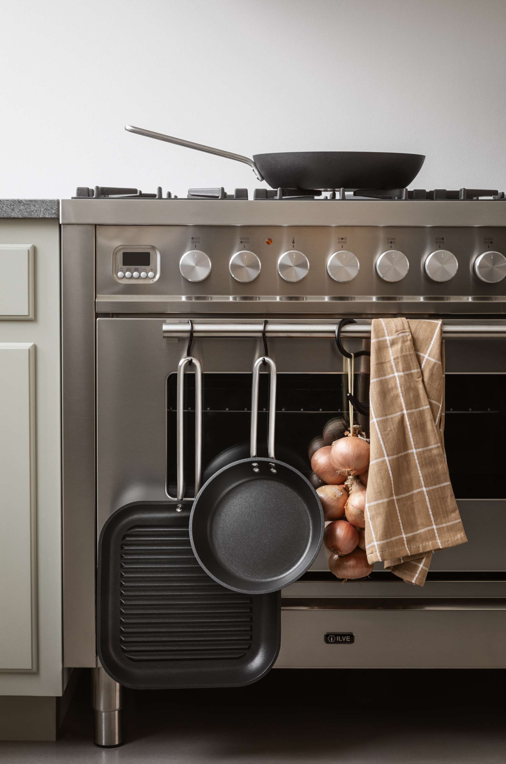 Det ultimata verktyget för den ambitiösa kocken. Perfekt för allt från hård stekning på hög värme till skonsam tillagning av känsliga ingredienser. Stommen på den professionella stekpannan är tillverkad av 85 procent återvunnet aluminium och utrustad med en 10 mm botten, en 7 mm kant och ett 10 mm trådhandtag. Den kraftiga konstruktionen garanterar maximal hållbarhet och utmärkt värmereglering och -fördelning. Den keramiska Slip-Let® beläggningen ger pannan en utmärkt släppförmåga som gör matlagning och rengöring enklare. Pannan tål temperaturer upp till 400 °C och fungerar på alla värmekällor, inklusive induktion. Vi erbjuder 5 års beläggningsgaranti och 25 års garanti på att pannan håller dess form och inte blir skev i botten. Tål maskindisk, men vi rekommenderar att du diskar pannan för hand för att bevara släppförmågan.