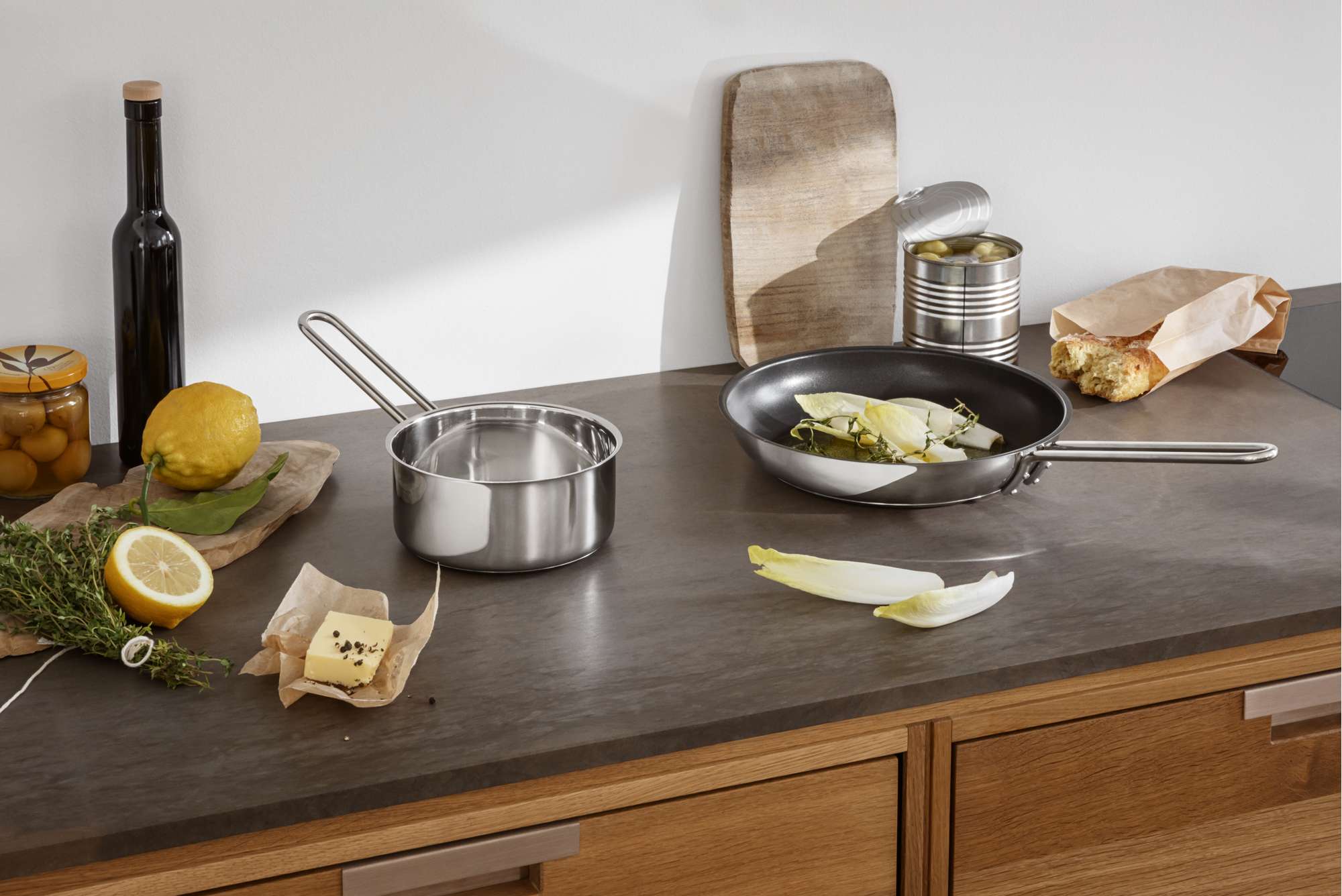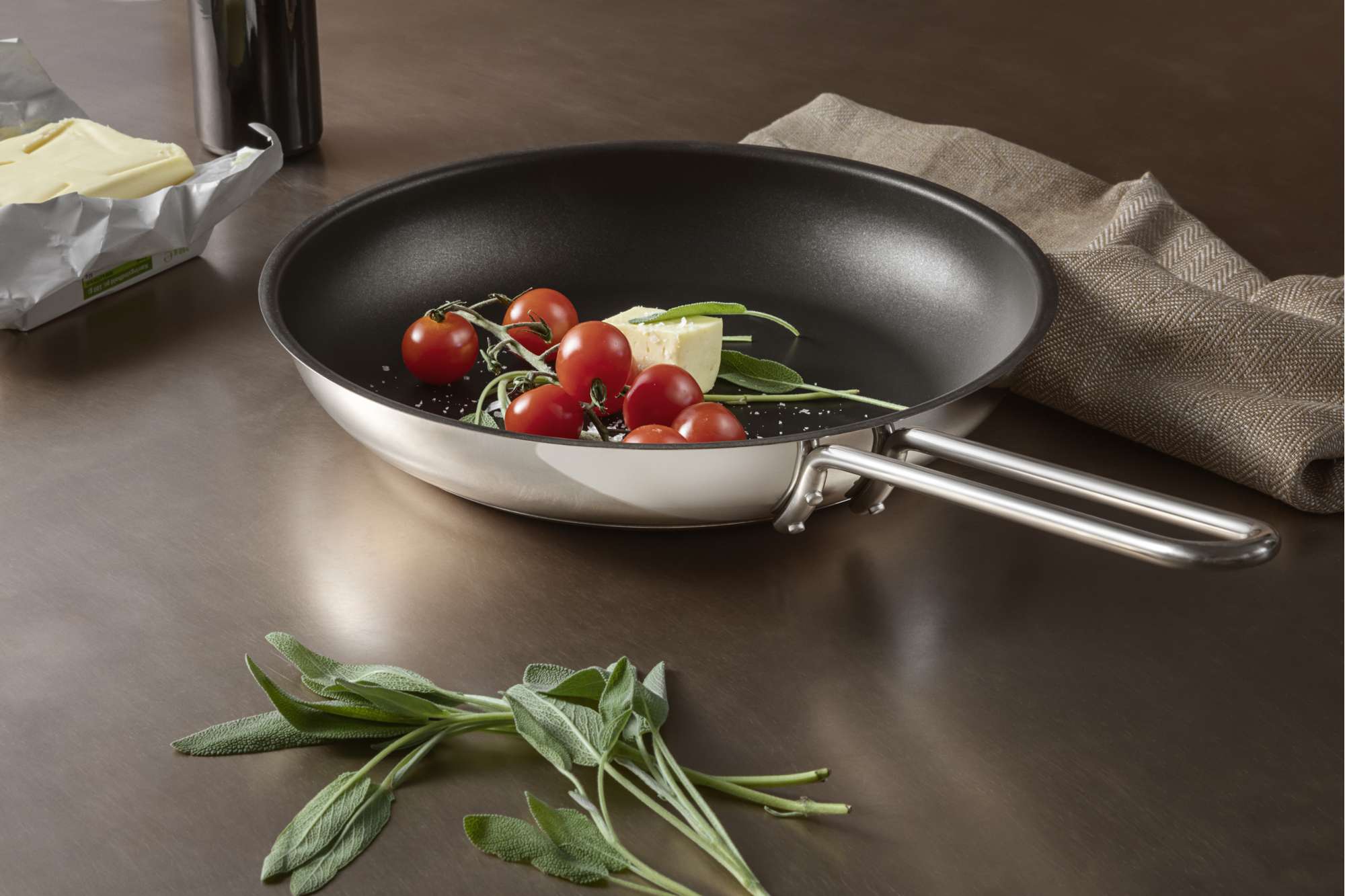 Stekpannans rundade sidor gör det lätt att komma åt med en stekspade. Slip-Let®-beläggningen förhindrar att maten bränns vid och det behövs bara ytterst lite eller inget matfett alls.
