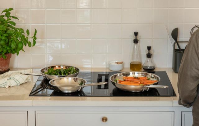 Den kraftiga sandwichbottnen fördelar värmen snabbt och jämnt. Pannan reagerar direkt när du justerar värmen – oavsett om du långsamt sjuder på låg värme eller bryner hårt på hög temperatur.
