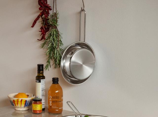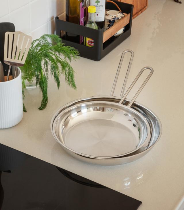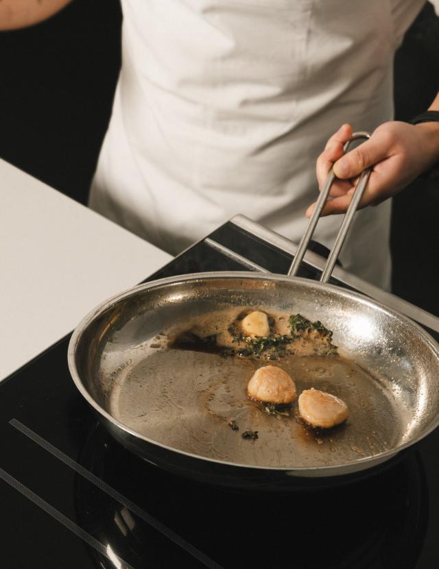 Steel Base står för kraft och precision. Den robusta sandwichbottnen fördelar värmen jämnt och reagerar direkt på temperaturförändringar. Den rena ytan av rostfritt stål – utan beläggning och PFAS-fri – ger en härligt krispig stekyta på kött, svamp och sparris. Ett naturligt val när du vill bryna, sautera och reducera såser direkt i pannan.